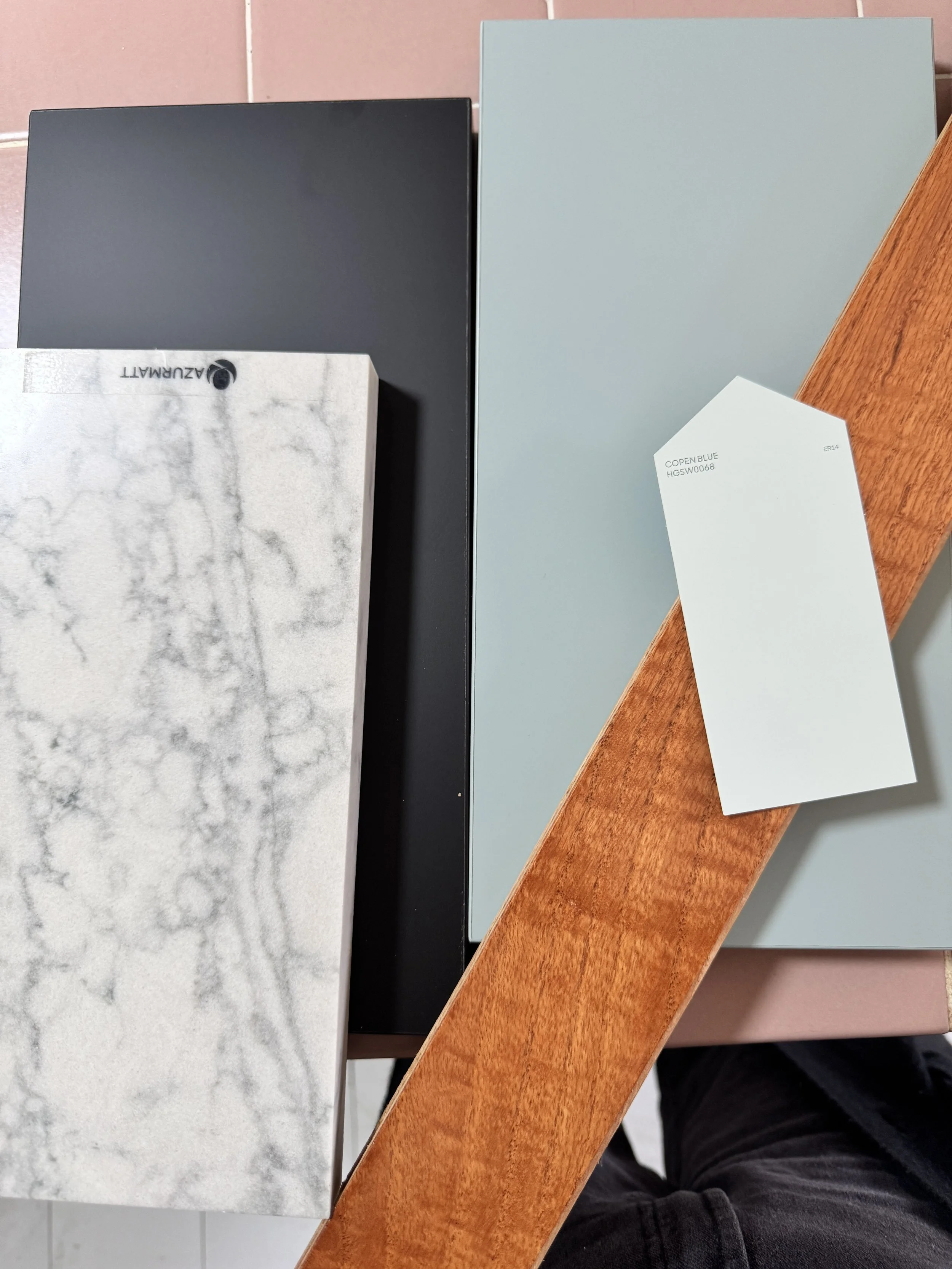 Often, our first instincts are close to the final vision but as the project evolves we refine those choices to make sure everything feels just right. The image above is a reference to some of our early material selections which we refined based on the overall esthetic.